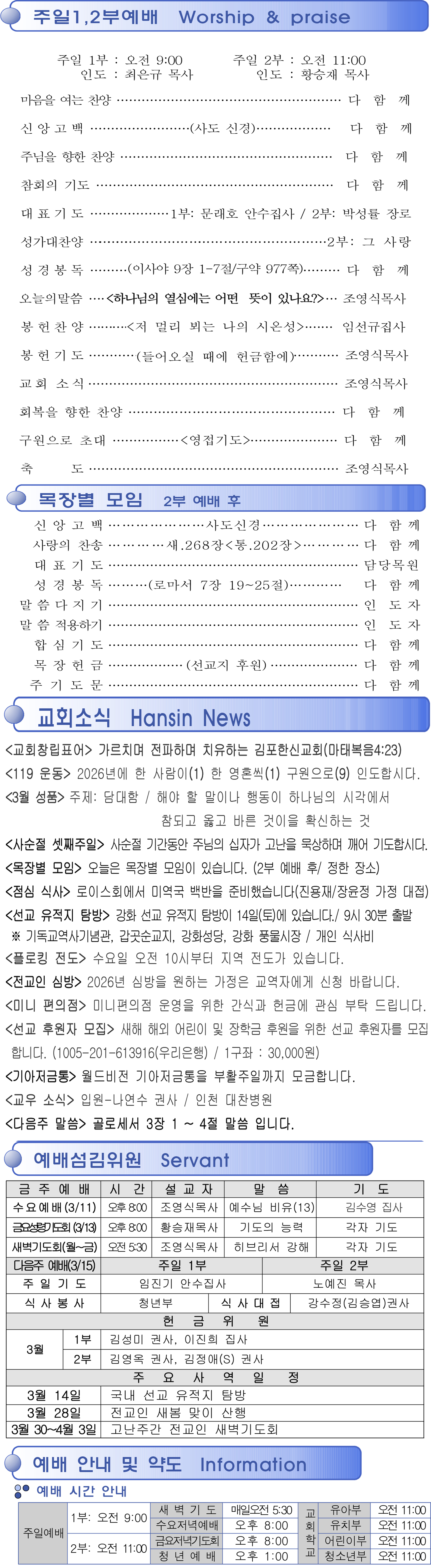 | 이전글 | 2026년 3월 15일 교회주보 | 황승재 | 2026.03.13 | 0 | 145 |