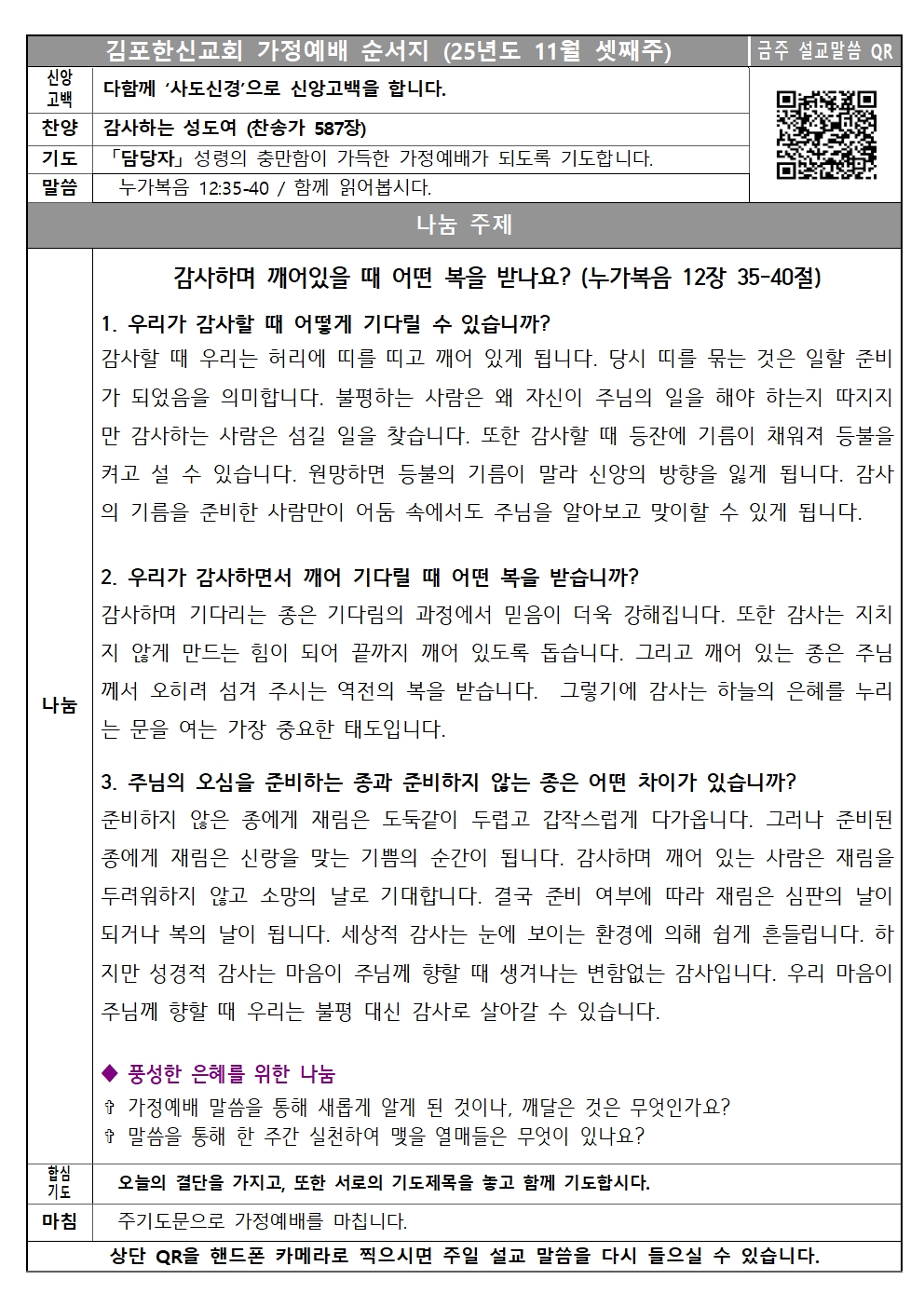 2025년 11월 셋째주 가정예배 순서지입니다.