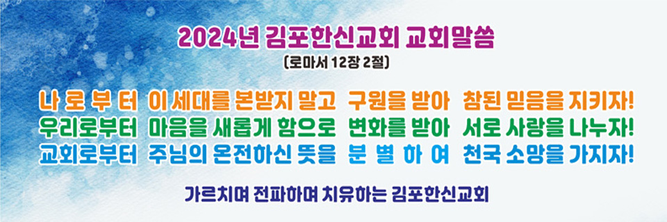 새롭게 시작하는 2024년에는 이 세대를 본받지 말고 오직 주님만을 바라보며 믿음 위에 든든히 세워져 가는 믿음의 김포한신교회가 되기를 소망합니다.